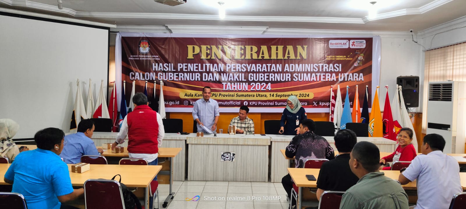 Medan, pelitaharian.id – Komisi Pemilihan Umum (KPU) Provinsi Sumatera Utara resmi menyerahkan hasil penelitian administrasi Calon Gubernur dan Wakil Gubernur Sumatera Utara untuk Pemilu 2024. Acara yang berlangsung di Aula KPU Provinsi Sumatera Utara pada Sabtu, 14 September 2024 ini menjadi salah satu tahapan krusial dalam memastikan bahwa para calon pemimpin Sumut mematuhi seluruh persyaratan yang ditetapkan.