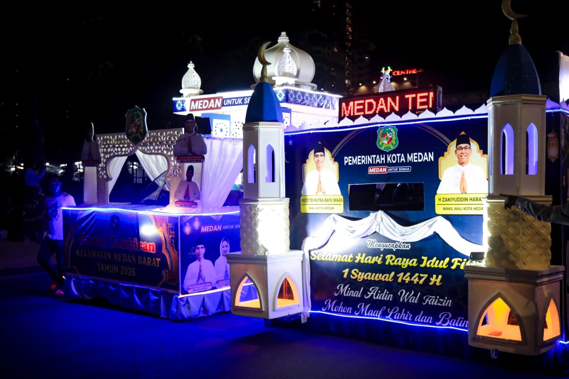 MEDAN, pelitaharian.id – Ribuan warga Kota Medan memadati kawasan Lapangan Merdeka pada Jumat (20/3/26) malam untuk merayakan malam takbiran menyambut Hari Raya Idulfitri 1 Syawal 1447 Hijriah. Kemeriahan semakin terasa dengan digelarnya pawai mobil hias yang dilepas langsung oleh Wali Kota Medan Rico Tri Putra Bayu Waas.