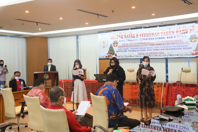 MEDAN, Pelitaharian.id – Perayaan Natal 2020 dan syukuran Tahun Baru 2021 keluarga besar DPRD Sumut yang digelar, Sabtu malam (16/1/2021) di Aula Gedung Dewan, hanya dihadiri 6 dari 35 anggota dewan yang beragama Kristen, tapi tidak mengurangi makna dan suka cita natal bagi ummat Kristen yang berada di lingkungan dewan.