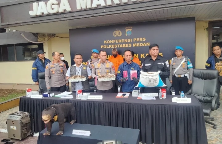Kapolrestabes Medan, Kombes Dr. Pol. Jean Calvijn Simanjuntak SH SIK MH, didampingi Kasat Reskrim AKBP Bayu Putro Wijayanto dan perwakilan BKSDA bernama Patar, menyampaikan, “Dari kedua pelaku, petugas berhasil menyita barang bukti berupa satu ekor Beruang Madu yang telah diawetkan dalam keadaan opset dan dibungkus dengan karton, serta satu karung goni berisi sisik Trenggiling.”