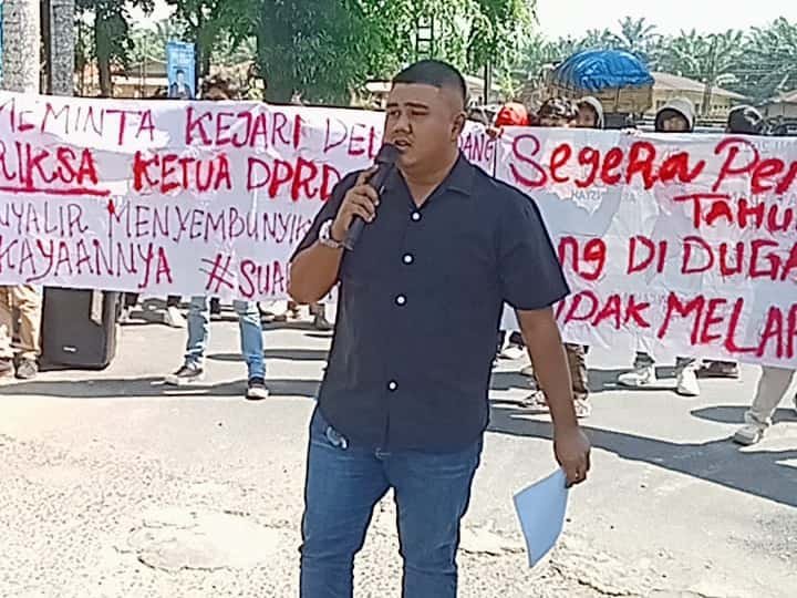 Ardiansyah Sitorus saat menyampaikan orasi di depan Gedung DPRD Deli Serdang, Senin (7/7/2025). Ia mempertanyakan penurunan drastis LHKPN Ketua DPRD Zakky Shahri dari Rp21 miliar menjadi Rp5 miliar. (Dok. Istimewa).
