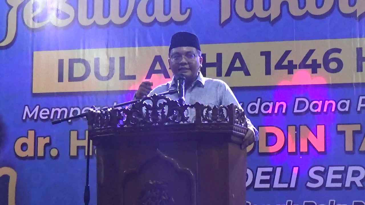 Ketua Pelaksana Festival Takbir Akbar ke-35, Gandhy Panigoro, S.AB, menyampaikan laporan kegiatan di hadapan ribuan peserta dan jajaran pemerintahan Kabupaten Deli Serdang, Kamis malam, 5 Juni 2025. Ia menegaskan pentingnya kegiatan ini untuk meningkatkan keimanan dan menjauhkan generasi muda dari pengaruh negatif. (pelitaharian.id/Foto: Aris).