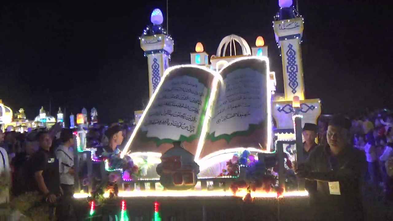 Miniatur kitab suci Al-Qur’an tampak megah menghiasi salah satu kendaraan hias dalam pawai Takbir Akbar di Desa Klambir V Kebun, Kecamatan Hamparan Perak, Deli Serdang, Kamis malam, 5 Juni 2025. Miniatur ini menjadi simbol syiar Islam dalam menyambut Idul Adha 1446 Hijriah. (pelitaharian.id/Foto: Aris).